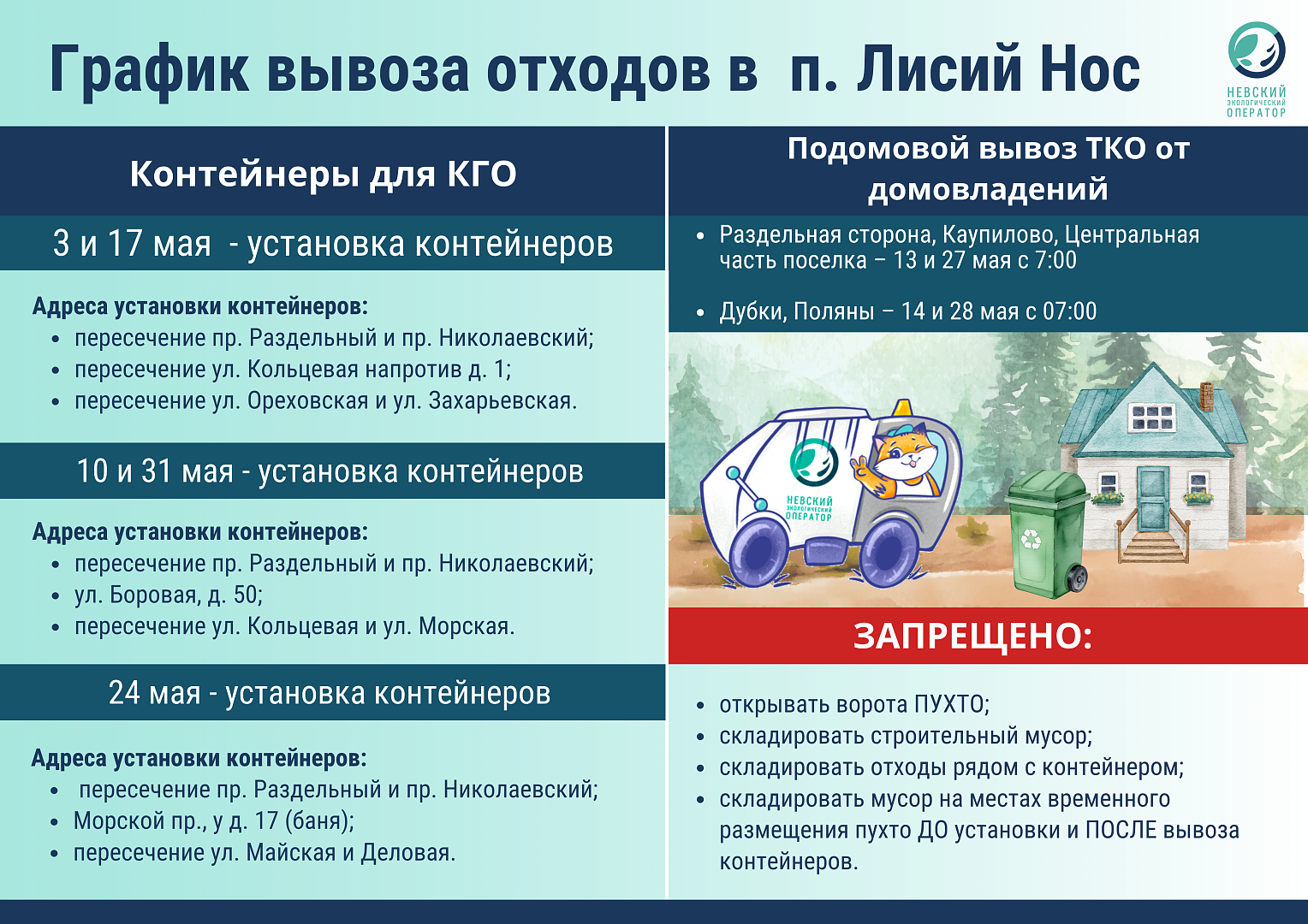 Невский экологический оператор информирует о графике вывоза ТКО в мае 2026 года.