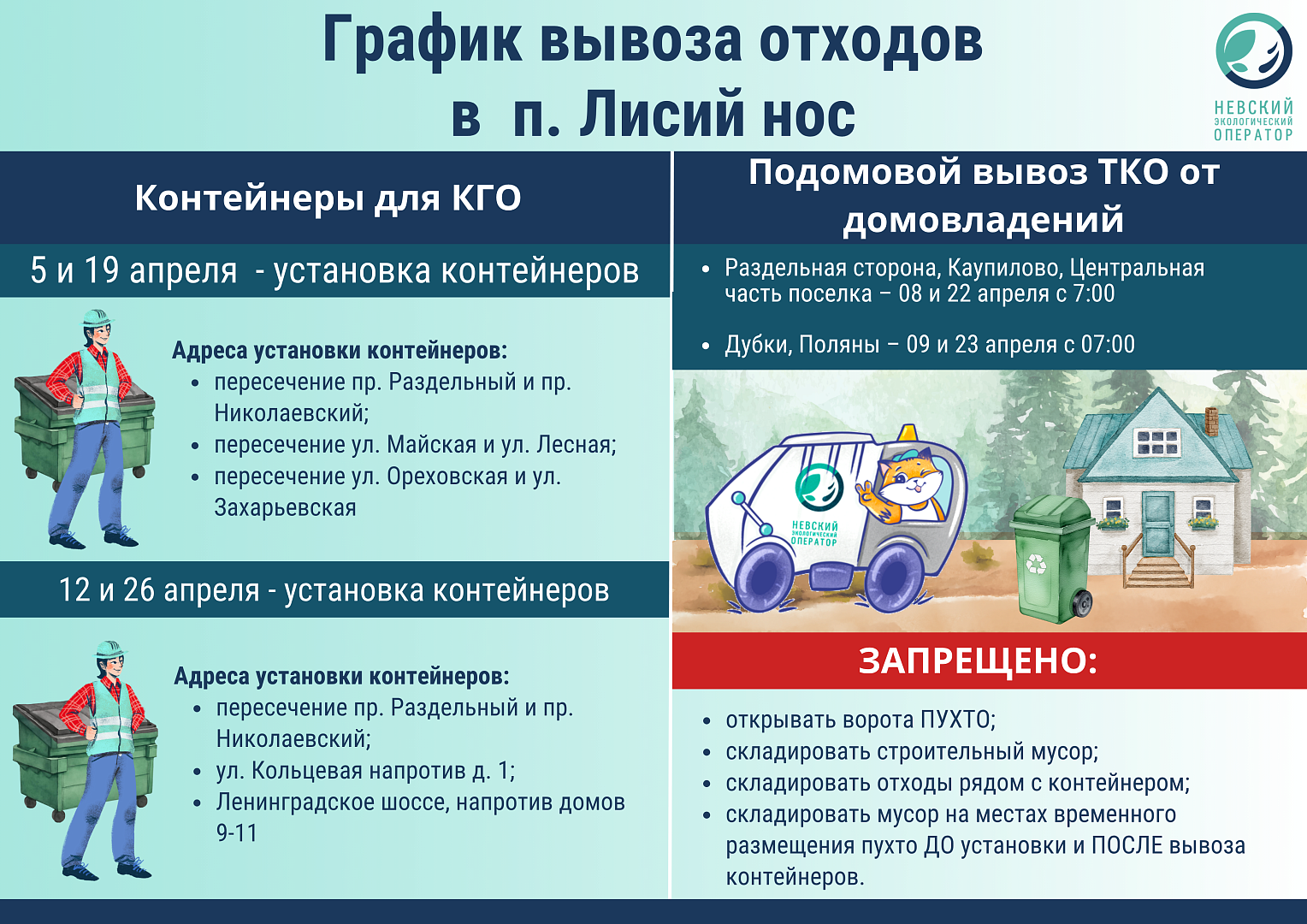 Невский экологический оператор информирует о графике вывоза ТКО в апреле 2026 года.